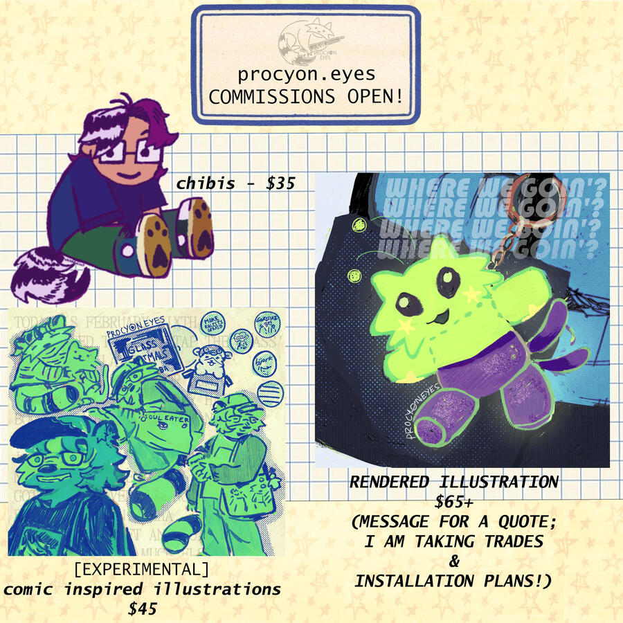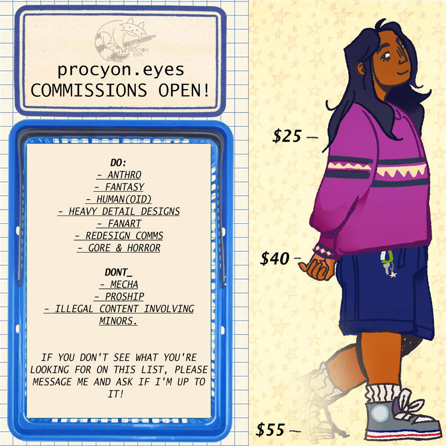I DON'T DO- I refuse to do any pieces containing: Dogwhistles, hateful content, exploitation of underaged characters, proship. More to be added.- Any requested changes can be done during the sketching process, but I will not implement any changes after the number of requests indicated in my TOS.- If there is something not listed here that you request, I have every right to deny the request based on my comfort with accepting the commission.